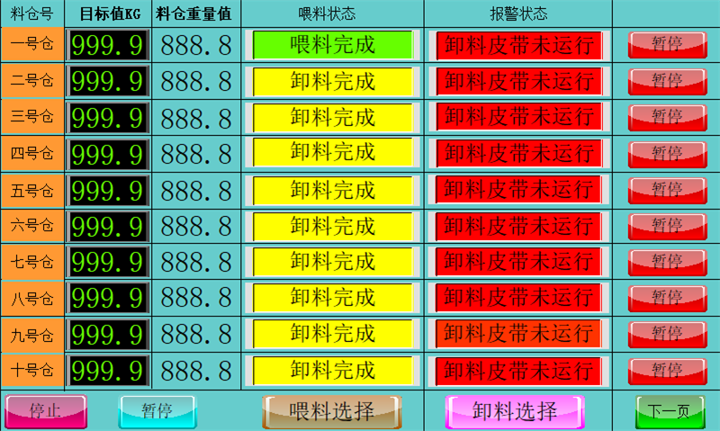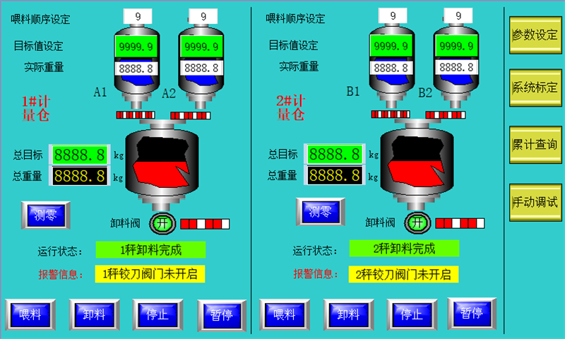 設置多個獨立儲料倉和多個獨立計量倉,對每種需要計量的物料預先按照各自配方進行喂料控制(分為高速喂料和低速喂料、提前量控制)進入計量倉內(nèi),等待生產(chǎn)需要時可以直接同步進行卸料。
